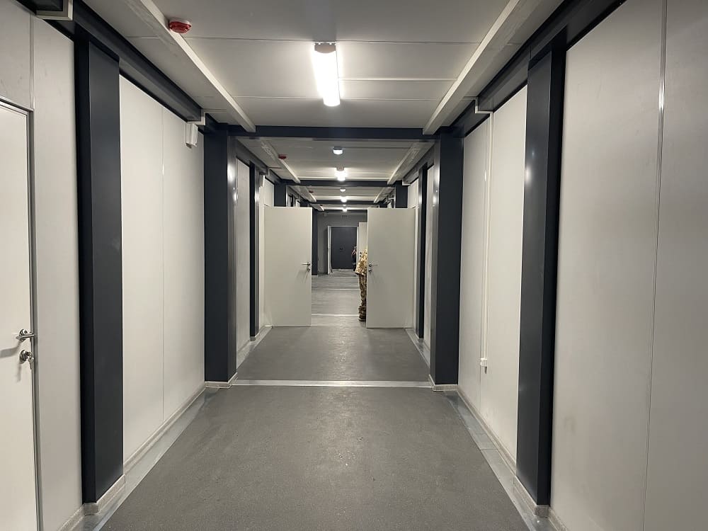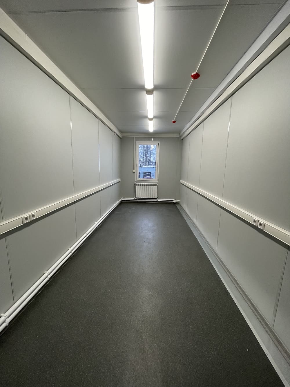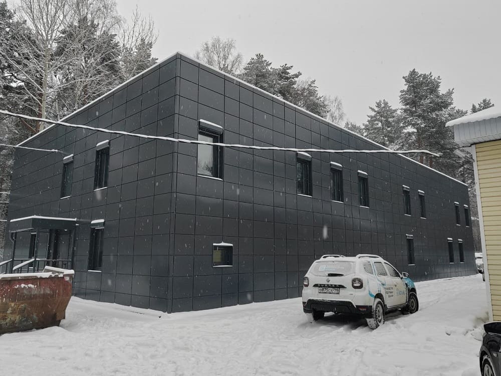 Очередной нестандартный проект. Отделка фасада металлическими кассетами собственного производства, внутренние стены усилены металлическим листом и решеткой, отделка стен панелями гипсоакрил и плиткой, отделка потолка СМЛ панелями. Здание оборудовано автоматическими усиленными рольставнями (4 класс). Часть помещений имеют бронированные окна и двери.