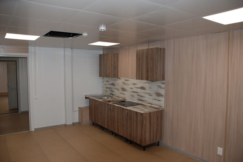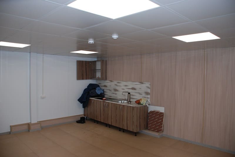 Модули имеют утепление 150 мм и высоту потолков 2300 мм. Каждый модуль оборудован электроконвектором, светильниками и розетками.